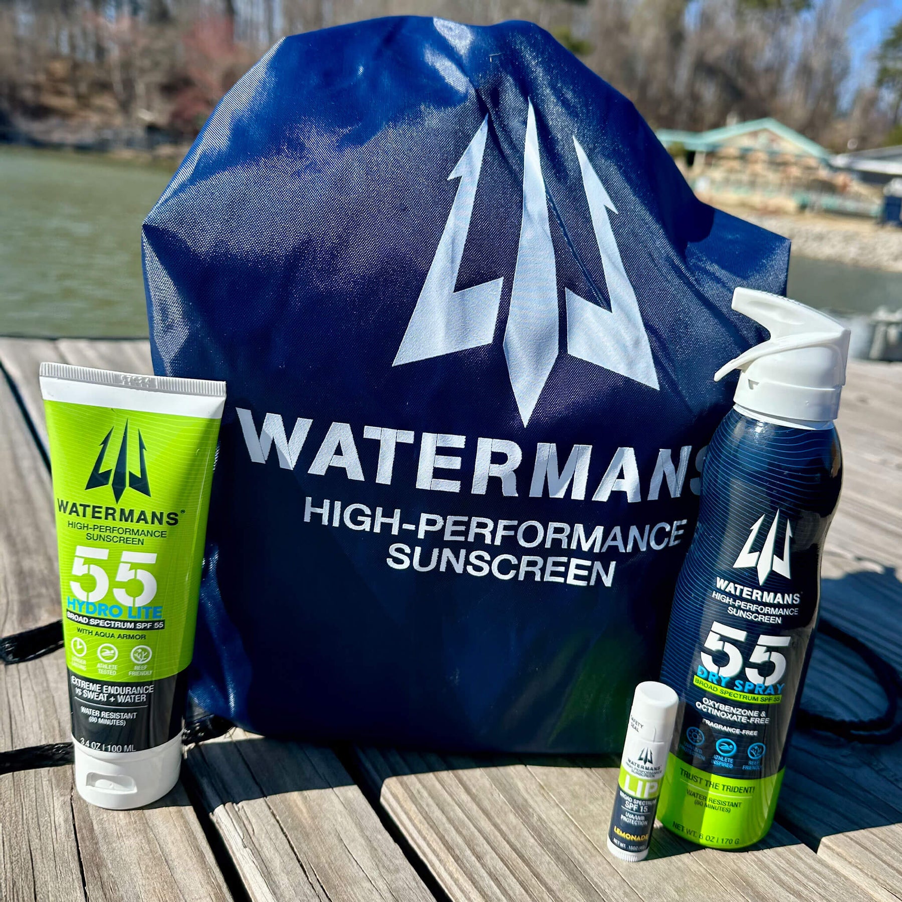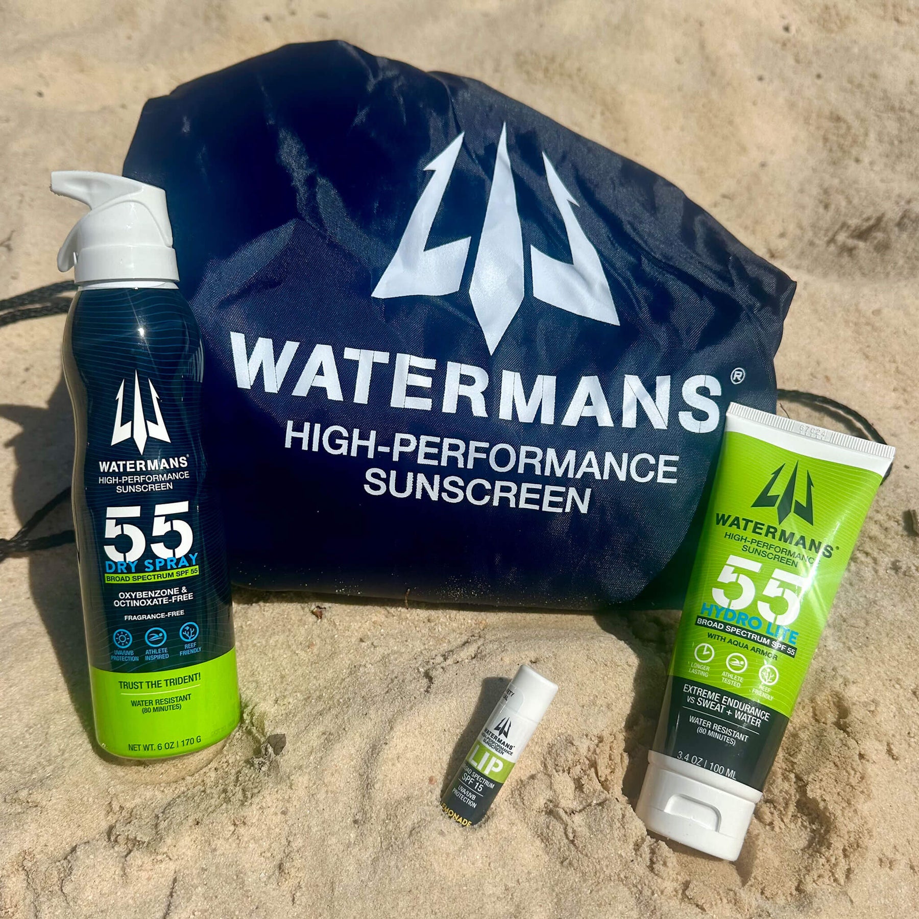 Beach Bundle SPF 55 has everything you need for Fun in the Sun! Enjoy Waterman's Spray SPF 55, Hydro Lotion SPF 55; Lemonade Lip, with a gear bag.