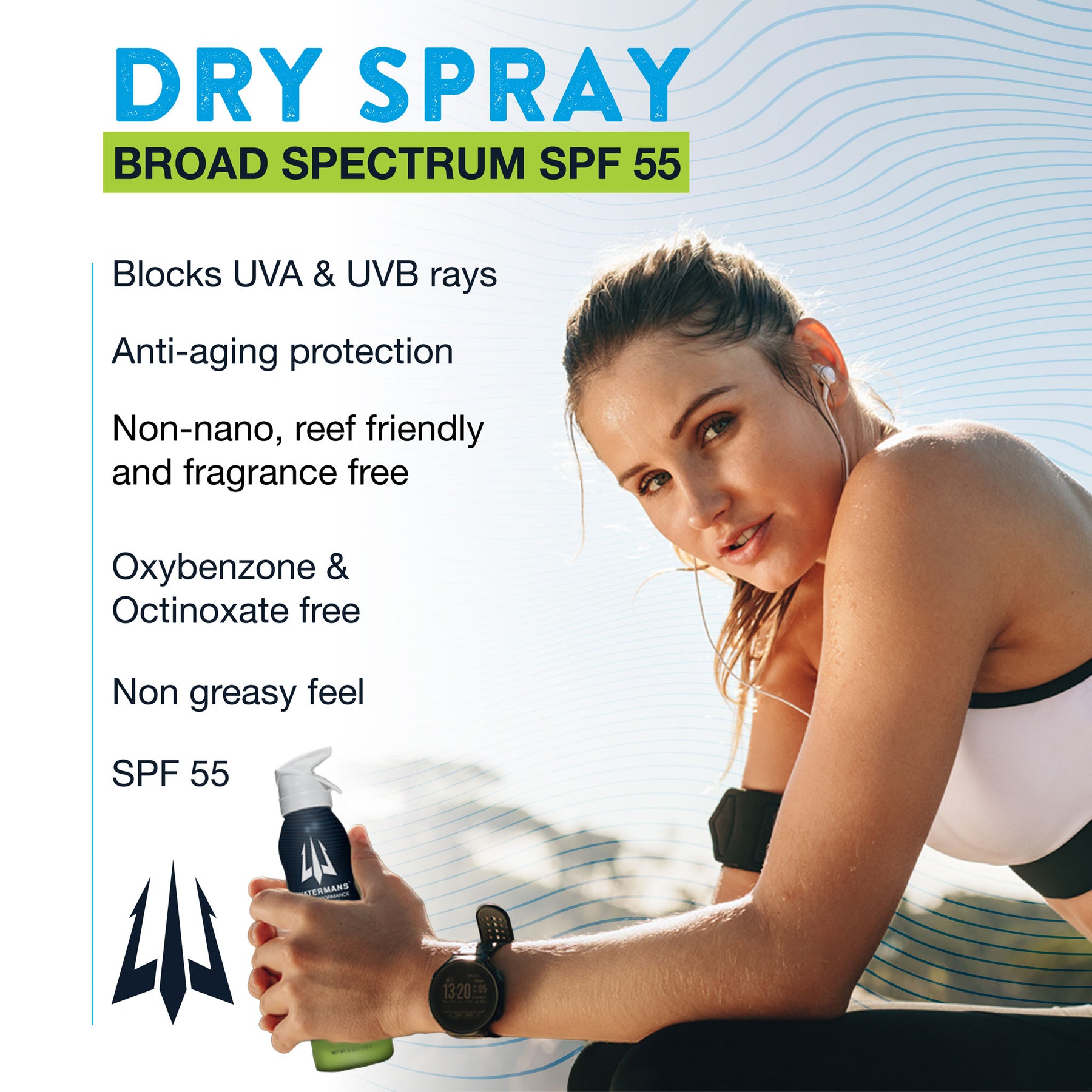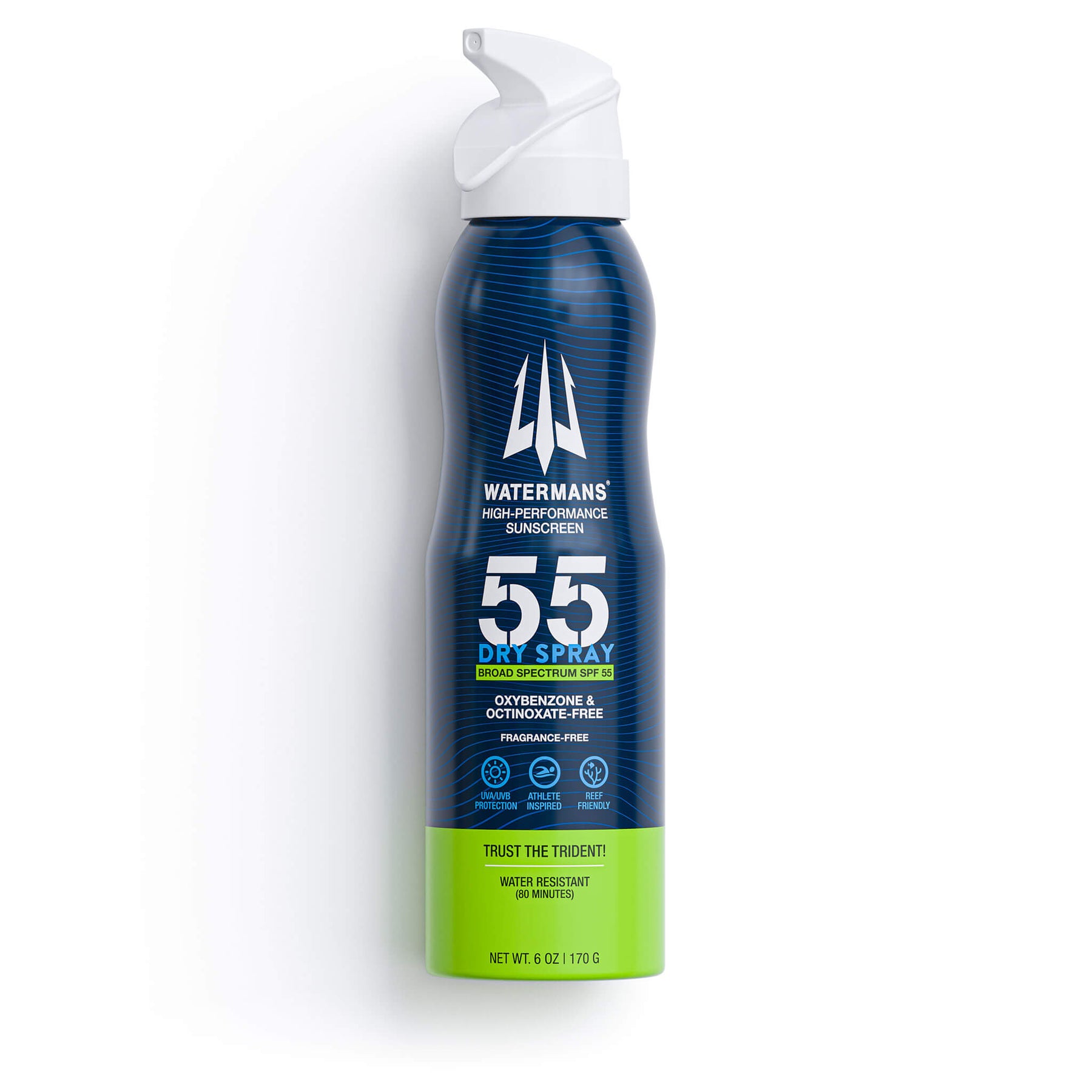 Waterman's Dry Spray SPF 55 Sunscreen is Reef Friendly, Fragrance Free and Oxybenzone Free. Our Dry Spray SPF 55 sunscreen provides perfectly balanced UVA/UVB protection for athletes and adventurers who spend their days in sun and water. Watermans® is engineered from the ground up to stand up to wind, waves, and weather.